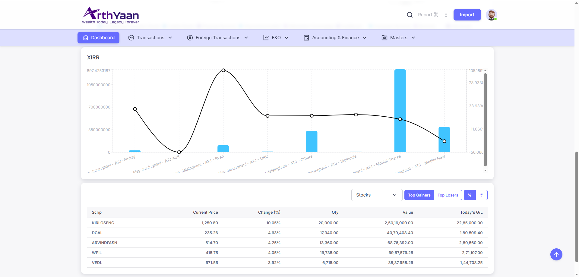 Track everything in one place—Stocks, Mutual Funds, PMS, AIFs, Bonds, F&O, FDs, Real Estate, and More. ArthYaan supports complex portfolios without compromising clarity or control.